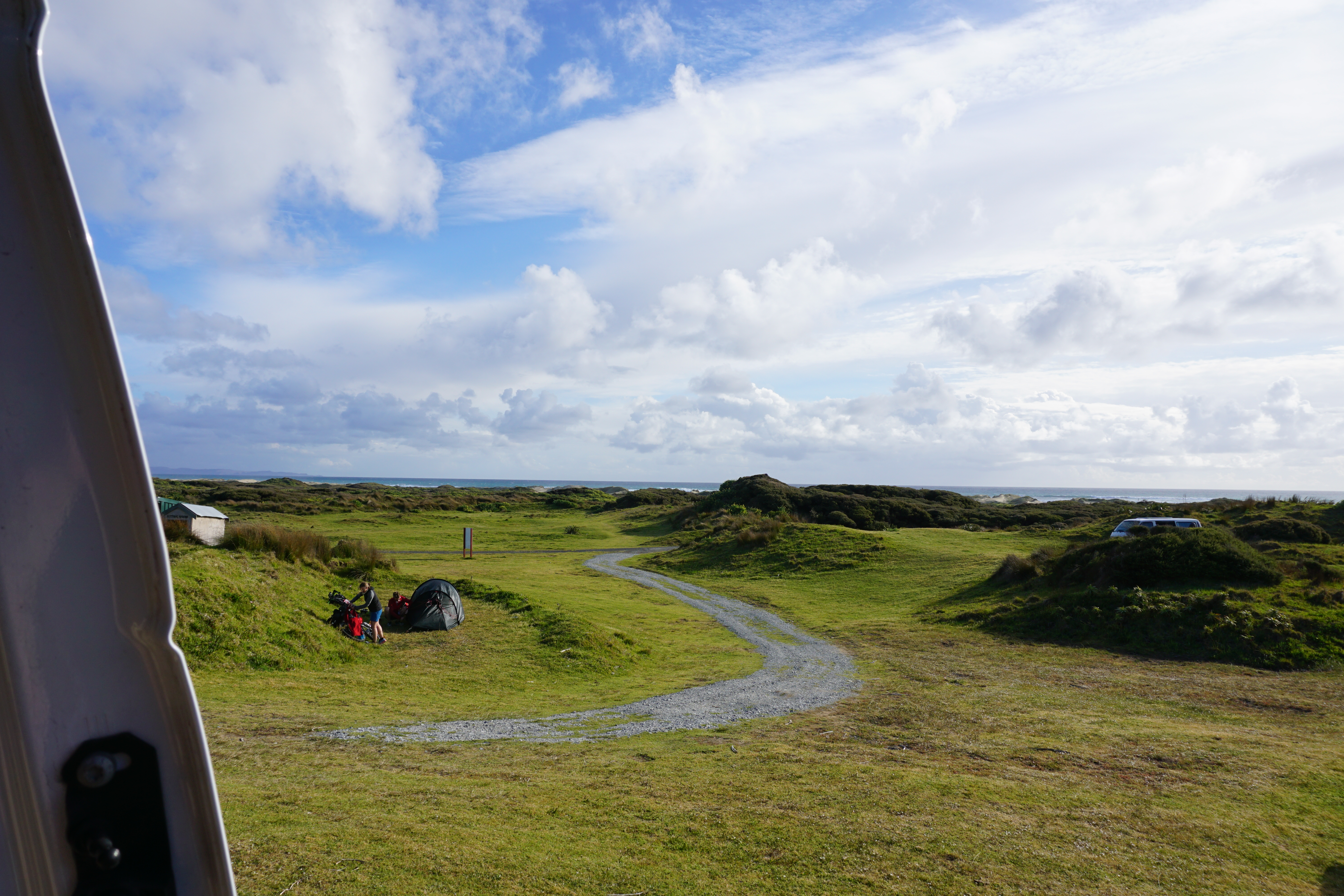 Auf dem Weg zurück nach Süden musste natürlich der sogenannte Ninty-Mile-Beach besucht werden, der die Westküste der Nordspitze ziert. Nach dem Trubel am Nordkap wollten wir wieder etwas mehr abseits sein, daher viel die Wahl zur Übernachtung auf den Utea-Park…was ein Erlebnis…auf einen Schlag in der Kurve hört die Teerstraße auf und die gravel Road beginnt…ca 7km. Hier lernten wir das man mindestens 60 km/h fahren sollte, da sonst das Auto auseinander fällt…aber Achtung, auch hier tauchen auf einmal Kreisel auf hrhrhr! Am „Park“ angekommen erwartete uns ein Hof, der sehr sehr merkwürdig war…wir beschlossen nix wie weg. War da nicht ein Kuhgitter vor ein paar hundert Metern. Also ab zurück, durchs Gitter und Richtung Strand…wow was für ein tolles Fleckchen Erde (Hukatere Lodge & Camping Ground). Mit Blick über die Dünen aufs Meer und urgemütlich…herrlich!