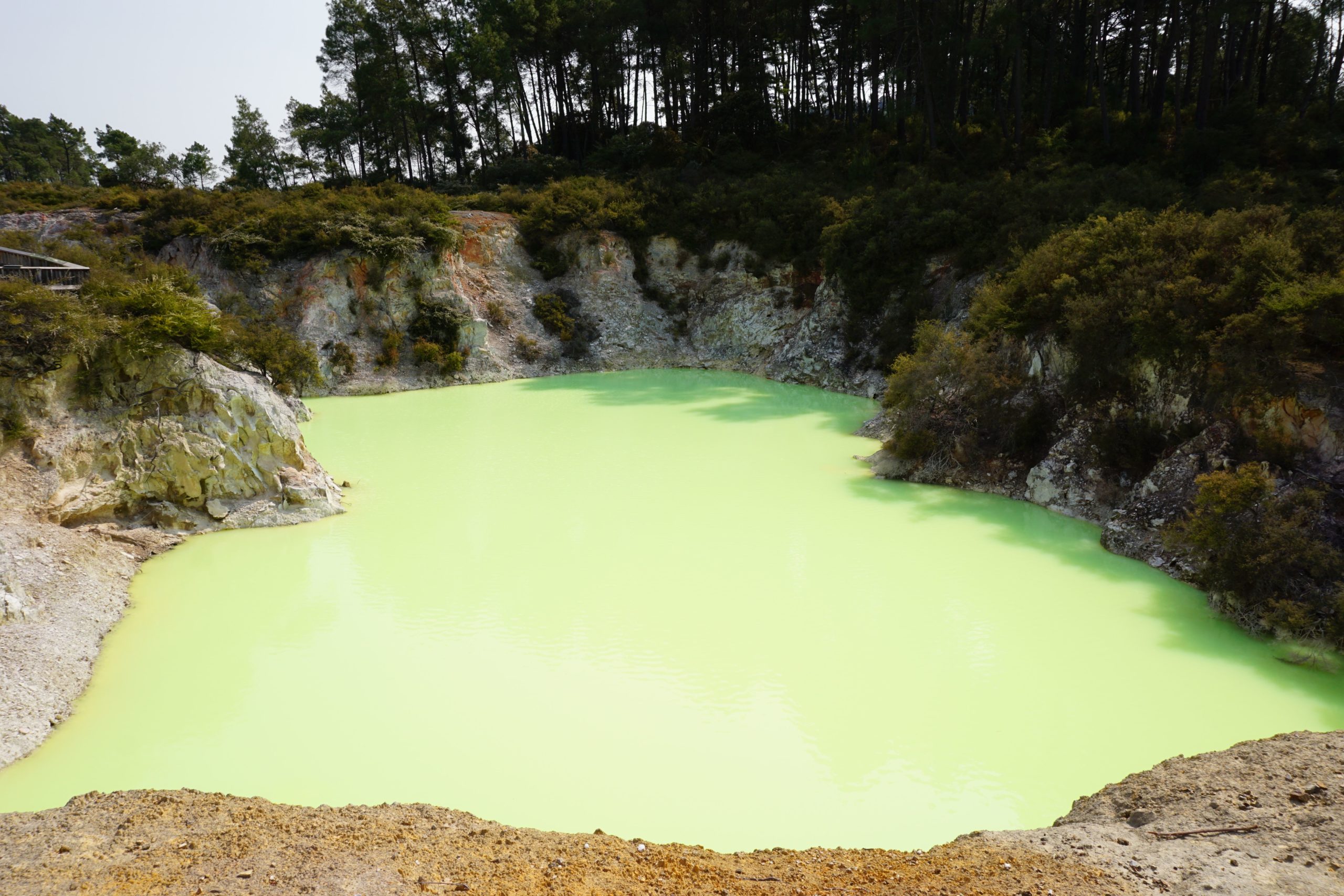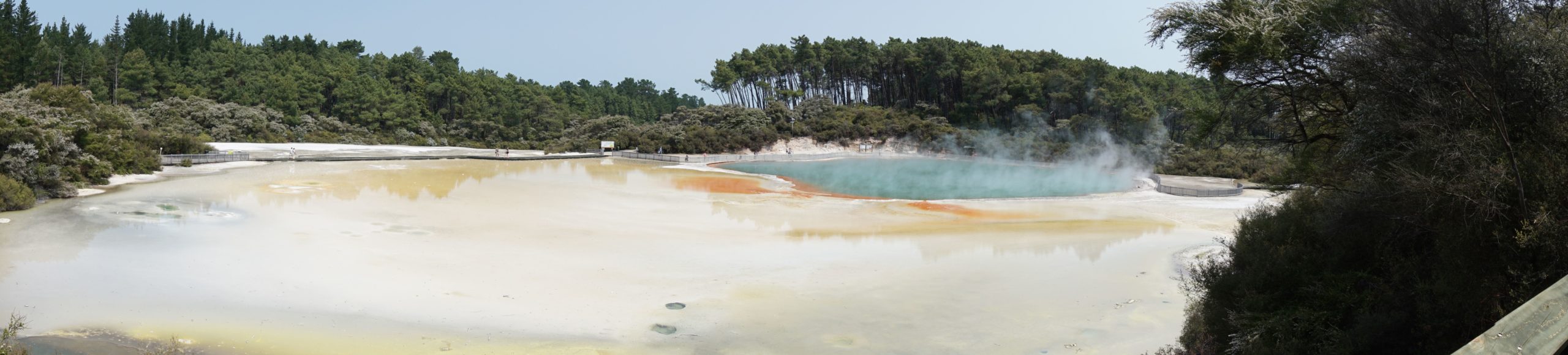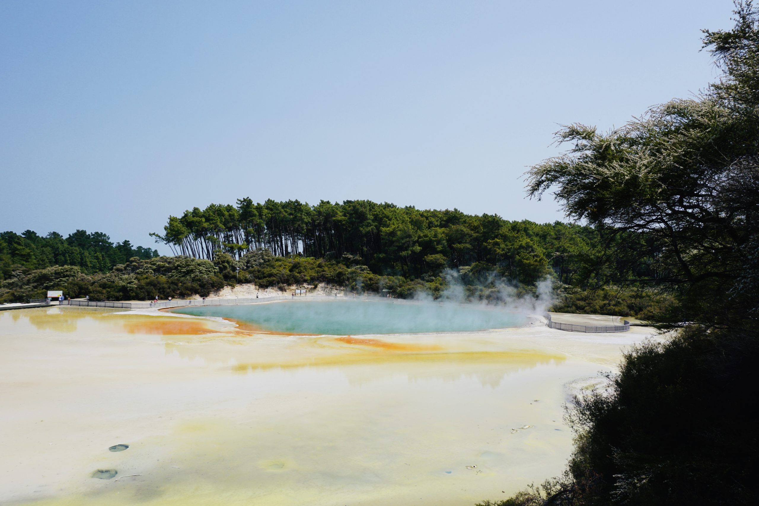 In der Campingplatzküche haben wir einen ganz netten Luxemburger kennengelernt, der Dieter gleich zu einem Guinness eingeladen hat. Aus dem Gespräch haben wir den Tipp bekommen nach Wai-o-Tapu zu fahren, dort kann man sehen, wie die Erde von unten aussieht, dass heißt Rohöl, Schwefel, Eisenoxid (verrostete Bäume), kochendes Wasser, blubbernder Matsch und vieles mehr.
