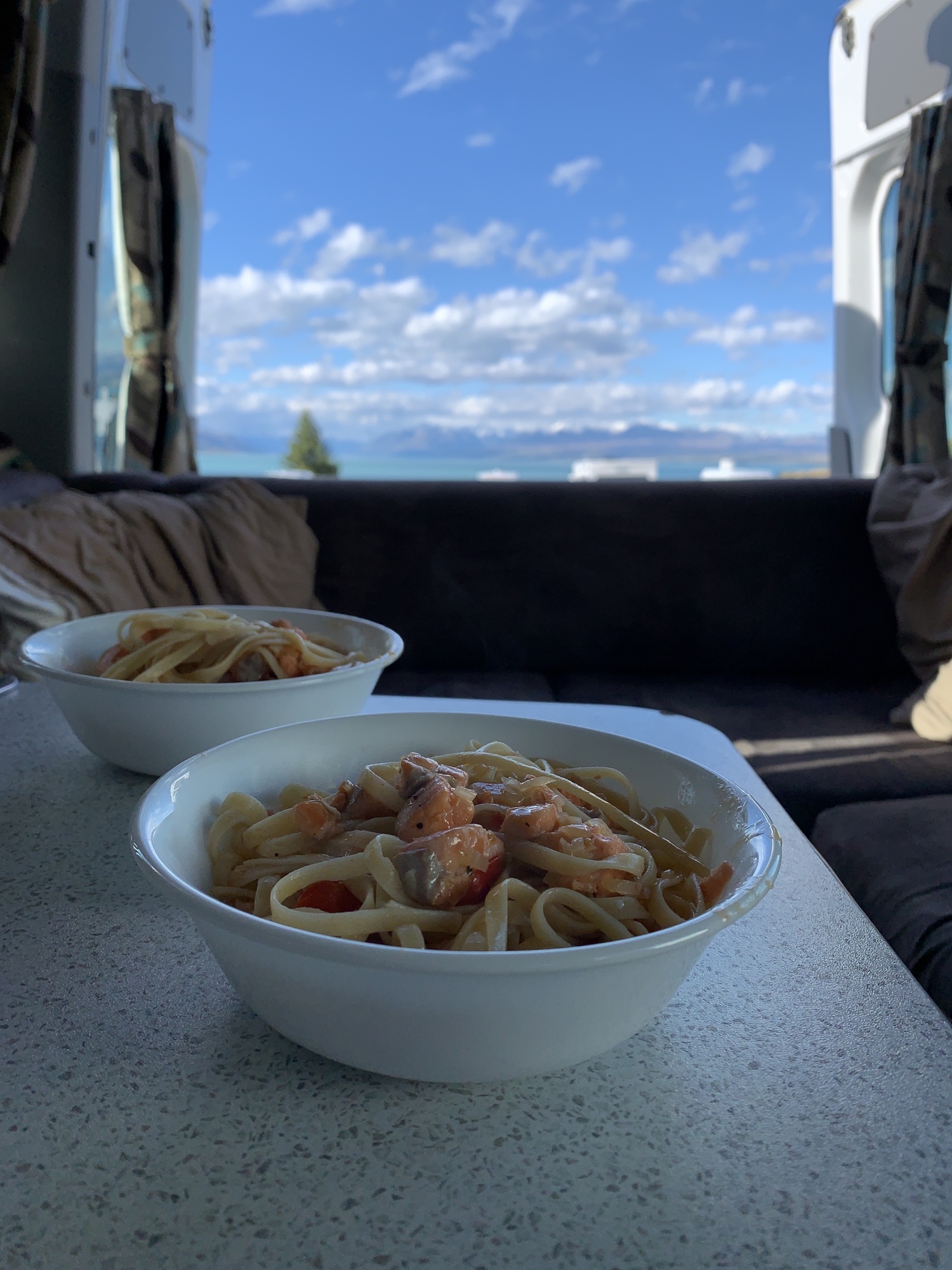 Da quasi fast jeder NZ Besucher hier vorbeifährt, sind wir einen See weiter geflüchtet, dem Lake Pukaki. Dort ließen wir uns auf einem freedom Camp direkt am See mit Blick auf den Mt. Cook nieder….einfach unbeschreiblich…vor allem hatten wir das Glück an diesem Tag Sonne geschenkt bekommen zu haben (und ein tolles Abendessen) ?